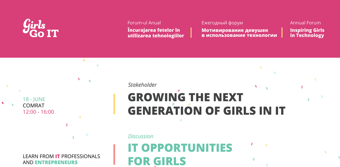 On June 18, the Annual GirlsGoIT forum took place, in Comrat. The event met the program participants and its partners to award TI products developed by the young girls from the 7 localities of the country (Chisinau, Straseni, Salcuta, Stefan-Voda, Ungheni, Comrat and Calarasi), as well as to discuss about economic ability and opportunities offered to these girls in ICT.