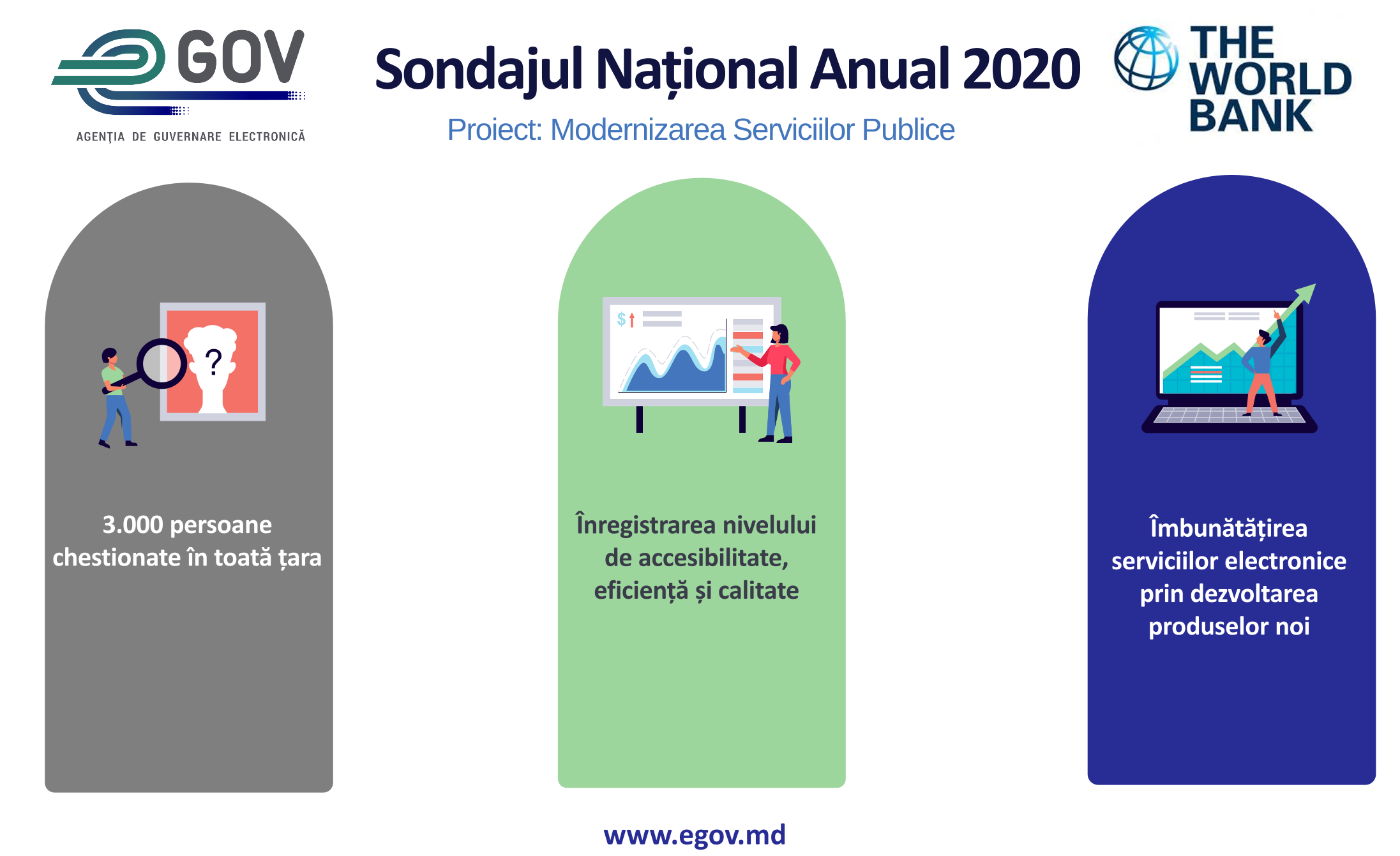 Cercetarea s-a axat pe 3 indicatori cheie ai Proiectului de Modernizare a Serviciilor Publice: accesibilitate, eficiență și calitate și a avut drept scop colectarea datelor privind nivelul de cunoaștere și utilizare de către cetățeni a platformelor guvernamentale electronice, precum și a nivelului de încredere a acestora în serviciile publice prestate în mediul online de către instituțiile statului.